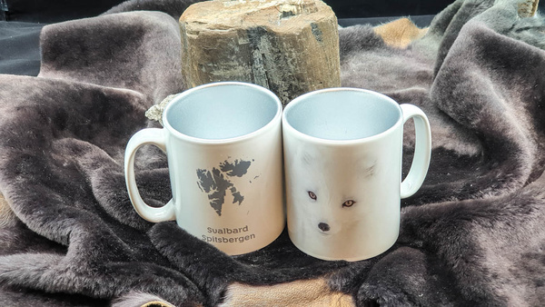 White ceramic mugs with a bright silver coloured inside. Each mug features a photo of one of Svalbards wildlife and a map of Svalbard. Each photo and the map is a delicate grey colour, to coplement the silver inner colour of the mug. The result is a truly sophisticated and wonderful mug.